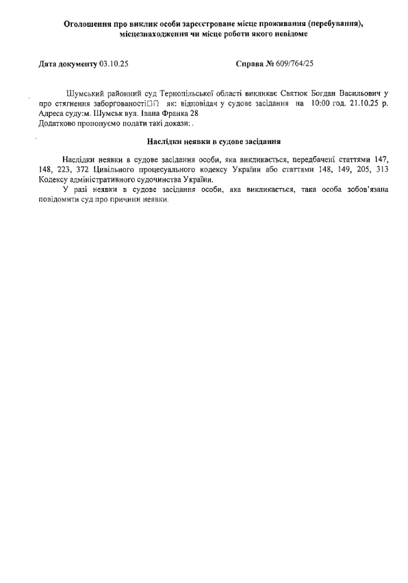 Шумський районний суд Тернопільської області викликає Святюка Богдана Васильовича