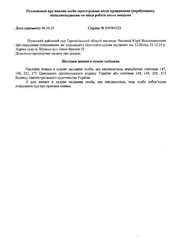 Шумський районний суд Тернопільської області викликає Лакомого Юрія Володимировича