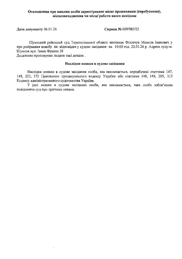Шумський районний суд Тернопільської області викликає Філіпчука Миколу Івановича