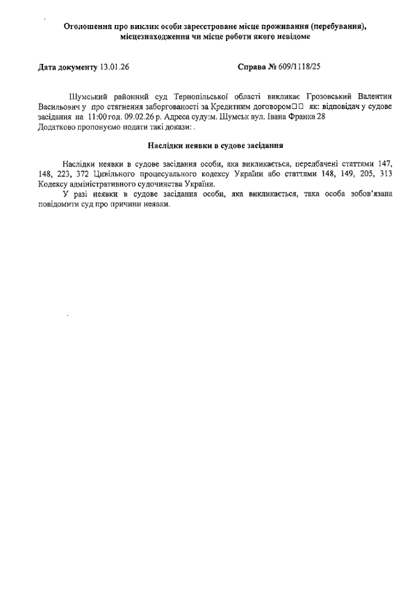 Шумський районний суд Тернопільської області викликає Грозовського Валентина Ваильовича