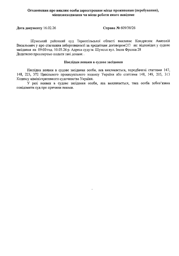 Шумський районний суд Тернопільської області викликає Кондратюка Анатолія Васильовича