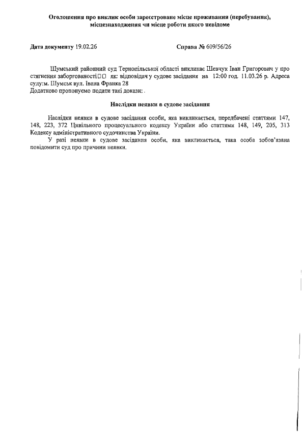 Шумський районний суд Тернопільської області викликає Шевчука Івана Григоровича