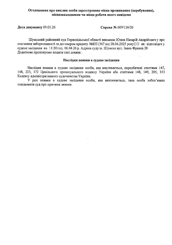 Шумський районний суд Тернопільської області викликає Юзюка Назарія Андрійовича